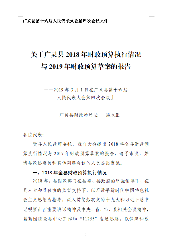 關(guān)于廣靈縣2018年財政預算執(zhí)行情況與2019年財政預算草案的報告